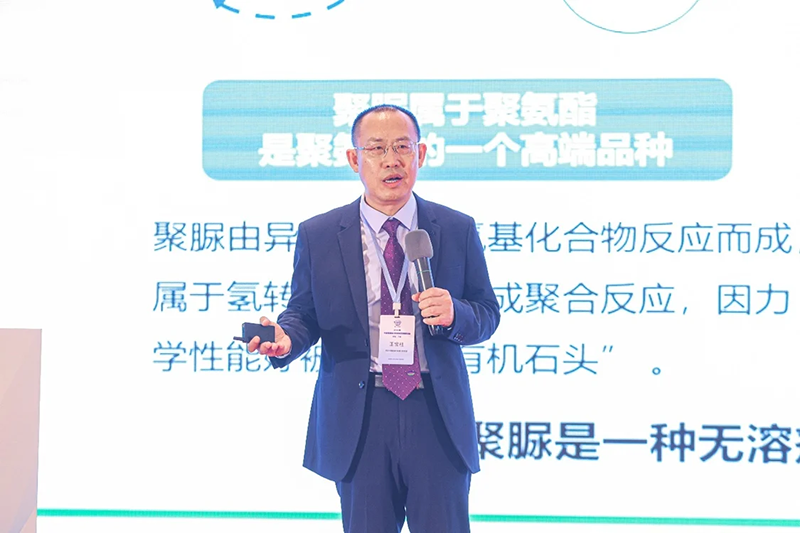 青島市聚脲彈性體重點實驗室主任王寶柱,演講的題目是《聚脲技術(shù)最新進展與前景展望》,介紹了特種功能性聚脲以及聚脲設(shè)備智慧化涂裝技術(shù)的研發(fā)及進展。并提出了聚脲行業(yè)高質(zhì)量發(fā)展建議。